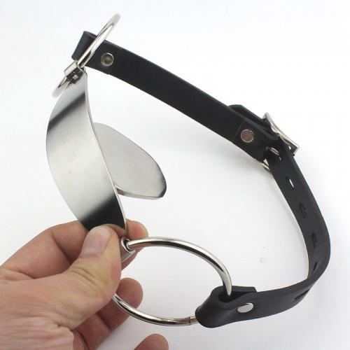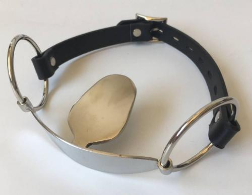 舌のようなステンレス製の板を咥えて装着するギャグです!