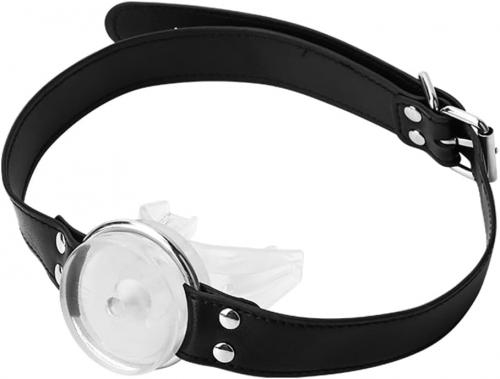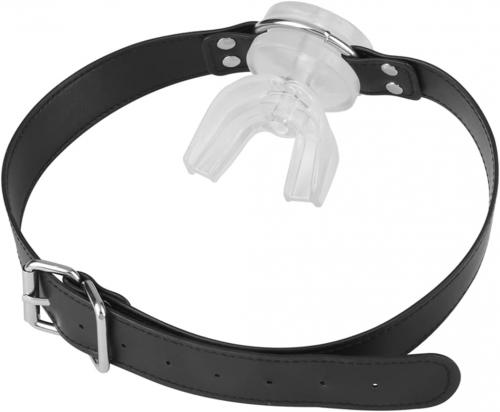 口を大きく開き、舌を固定するような形で装着するギャグです。